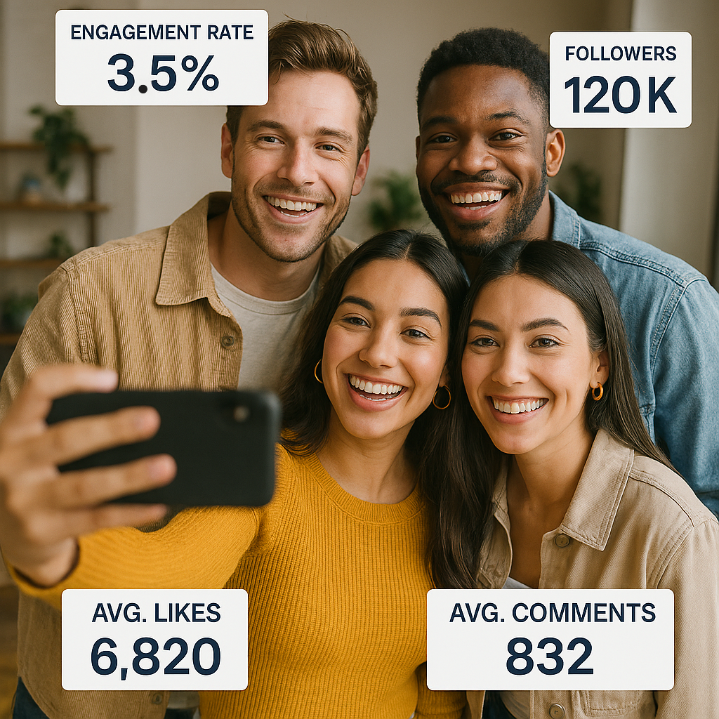 Access detailed analytics including engagement rates, audience demographics, growth trends, and authenticity scores.